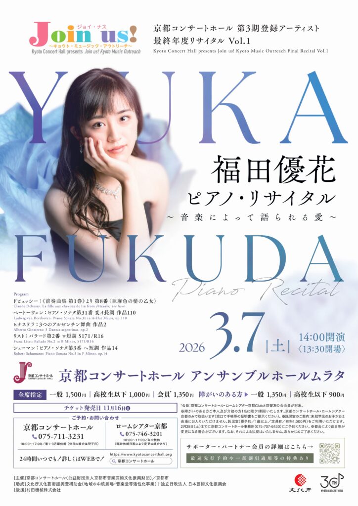 2024年度から2年間、京都コンサートホール第3期登録アーティストとして活動してきた、ピアニストの福田優花さん。2024年度は市内の小学校、2年目となる2025年度は小学校に加え、幼稚園や支援施設にも伺い、クラシック音楽を届けてきました。